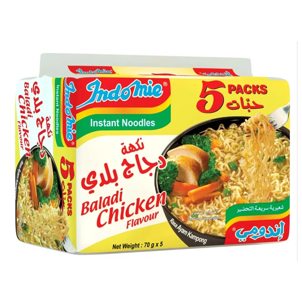 Baladi Chicken Indomie Noodles 4x5pkt. Delicious instant noodles with classic chicken flavor, quick and easy to prepare.