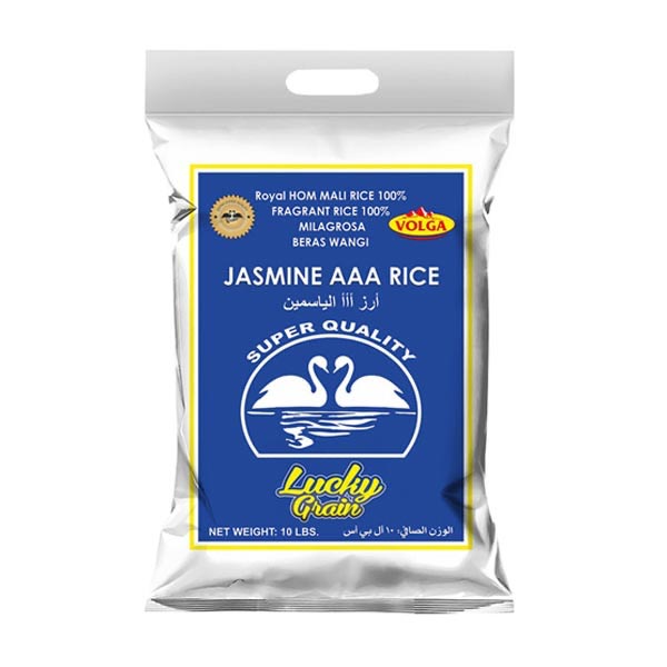 Volga Jasmine Rice 10lbs (4.5kg) x 10 pack. Premium fragrant rice with soft texture and natural aroma, ideal for bulk use.
